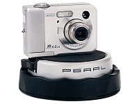 The pocket camera on the turn table below is a very cheap solution; about 15 Euros. I have not found a specific product or manufacture name, though. It shows up in searches for "Panorama Drehteller". Next to it is a more professional solution, the Gigapan Systems Epic 100 Panorama Robot. It can take a DSL, and pan both horizontally and vertically. You need both if you plan on using a 200mm lens.
