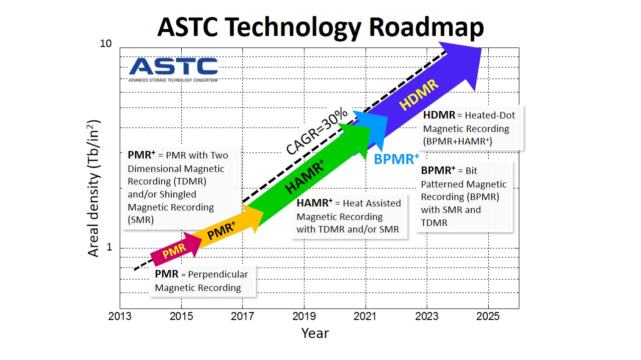 ComputerWorld is reporting on a roadmap from the industry consortium ASTC where they predict magnetic hard drives will reach 100 TB by 2025. This is based on the figure below, where they project data areal density will increase a ten-fold from today's 1 Tbit per square inch.