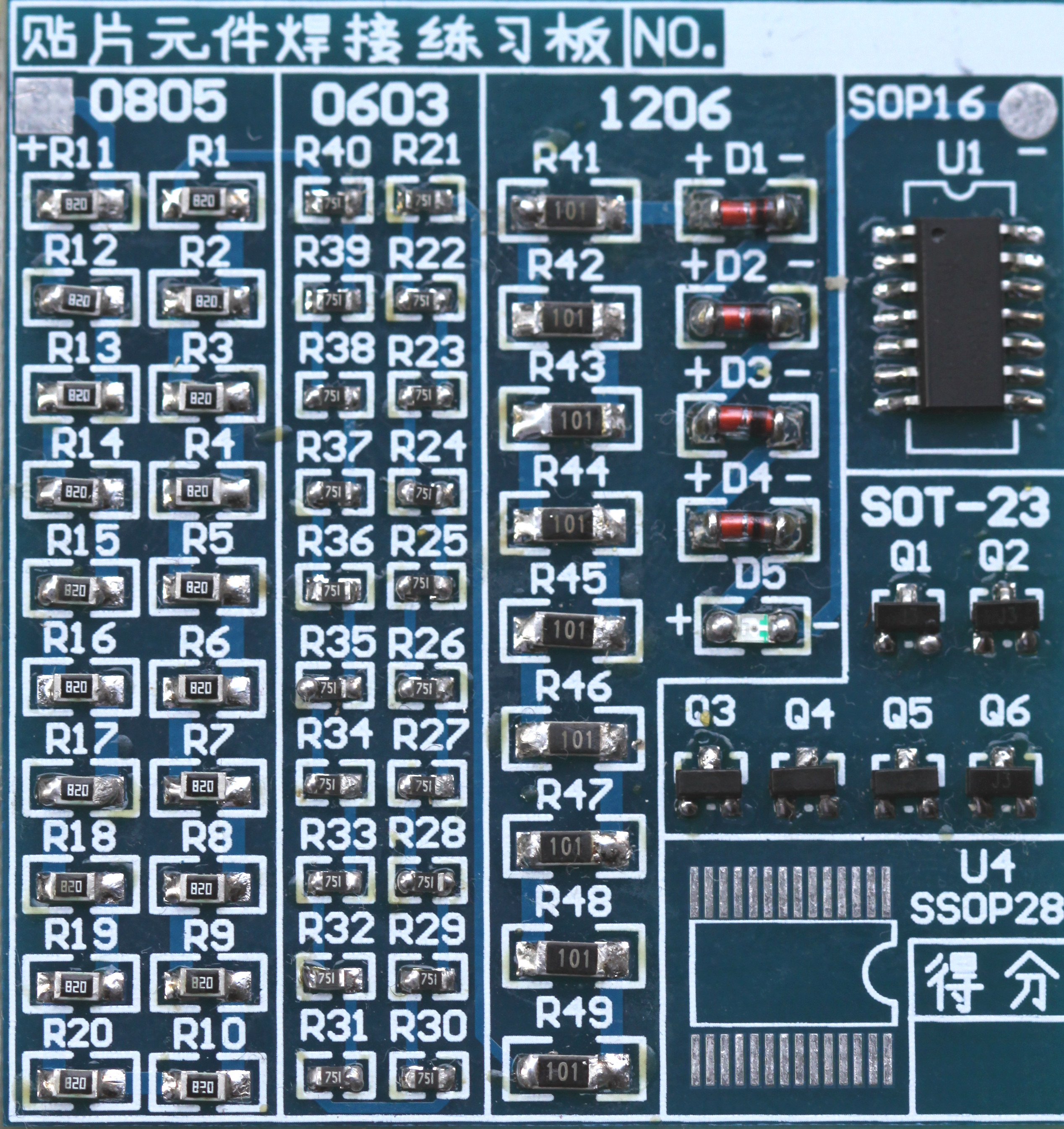 I recently got a $3 practice board for soldering SMD devices. It comes with components of various sizes, including resistors in 1206, 0805, and 0603 sizes; 1206 didoes; SOT-23 transistors; and a SOP14 chip. The board itself has no purpose, and only the resistors and didoes are actually connected. Given that the goal of this was to practice soldering, I'm happy with the outcome, as seen in the pictures below.