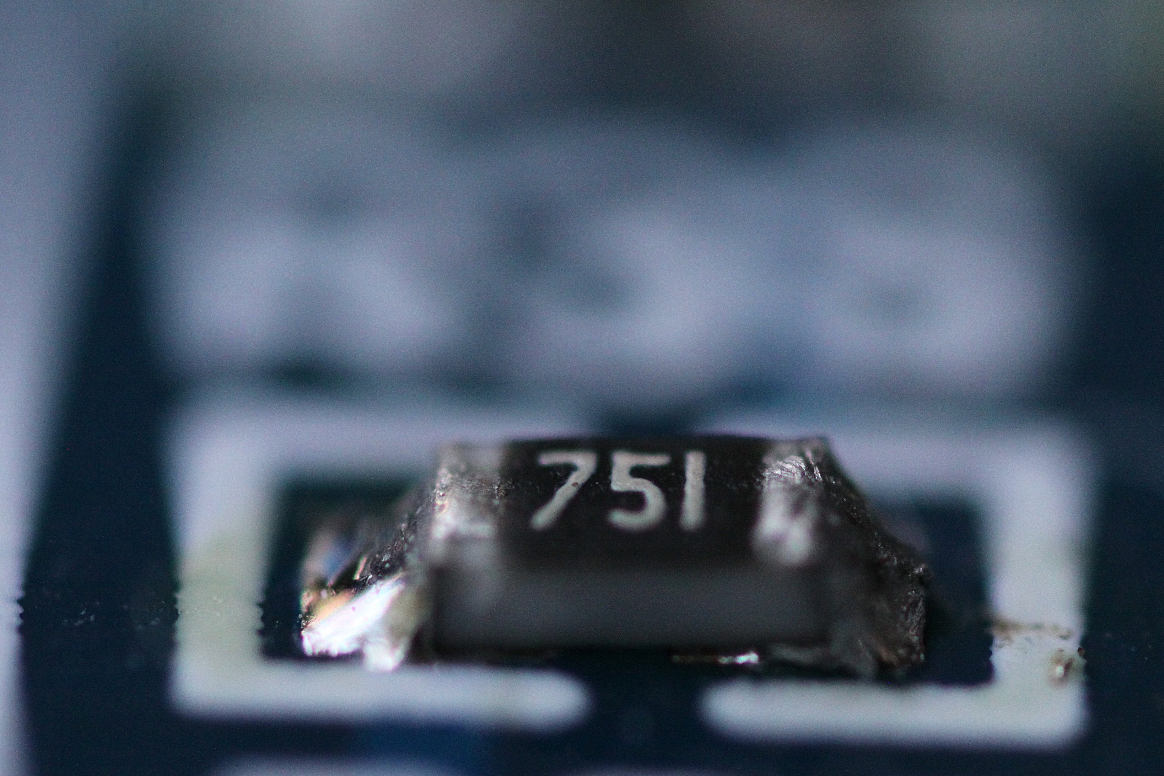 8. Using a magnifying glass and tweezer, orient the component in almost the correct location, right next to the pre-soldered pad from step 4.