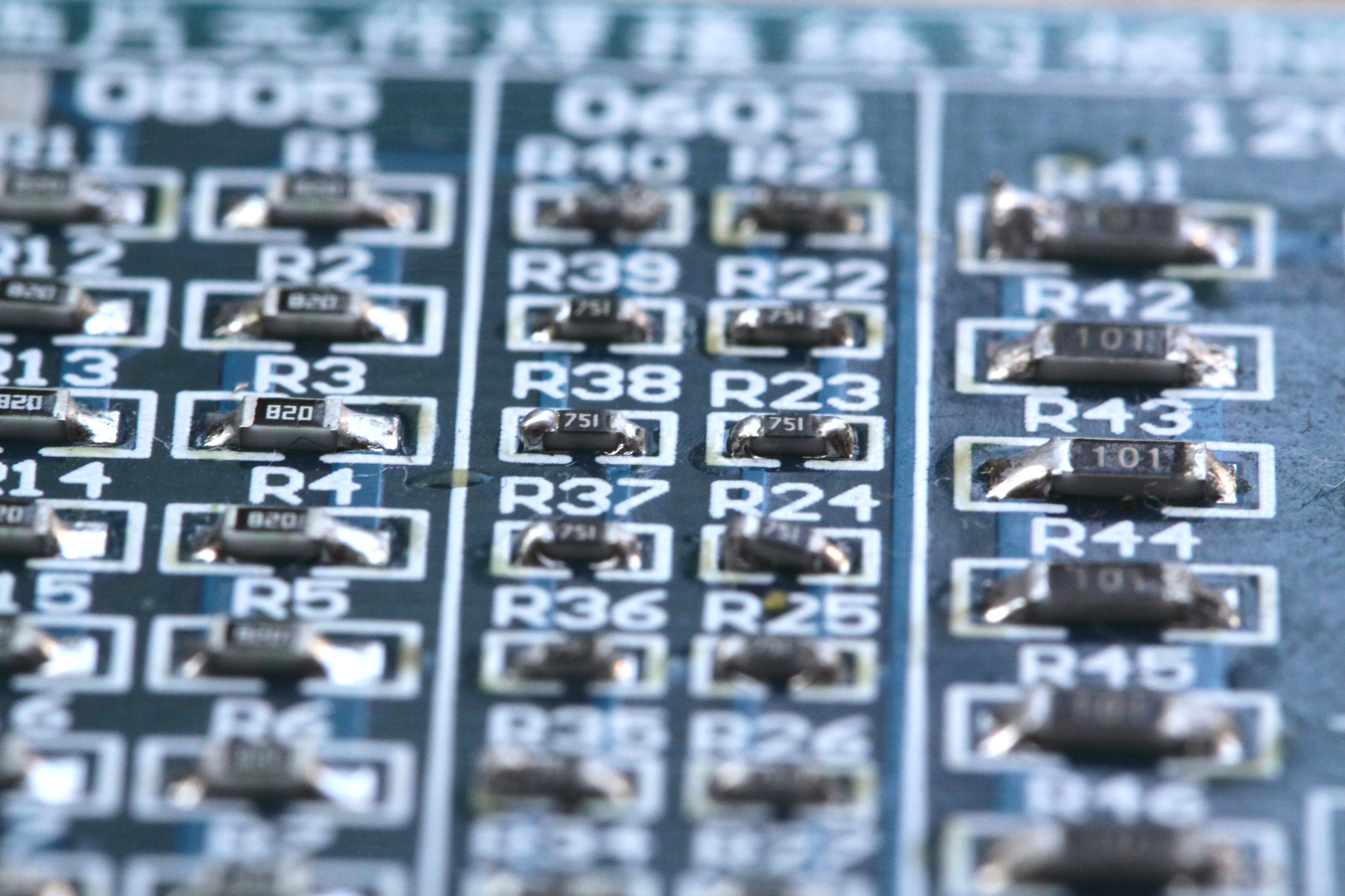 As can be seen, the 100 Ω resistors ("101") are 1206 (3.2 x 1.6 mm); 82 Ω ("820") are 0805 (2.0 x 1.25 mm); and 750 Ω ("751") are 0603 (1.6 x 0.8 mm).