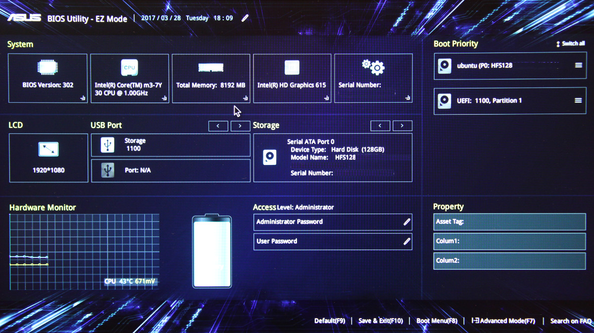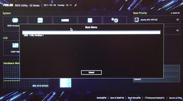 Once ready, plug in the USB stick, restart the machine, and hold F2 to enter the BIOS / UEFI setup. (Holding ESC will show the temporary boot selection menu). The "easy" mode can be seen below.