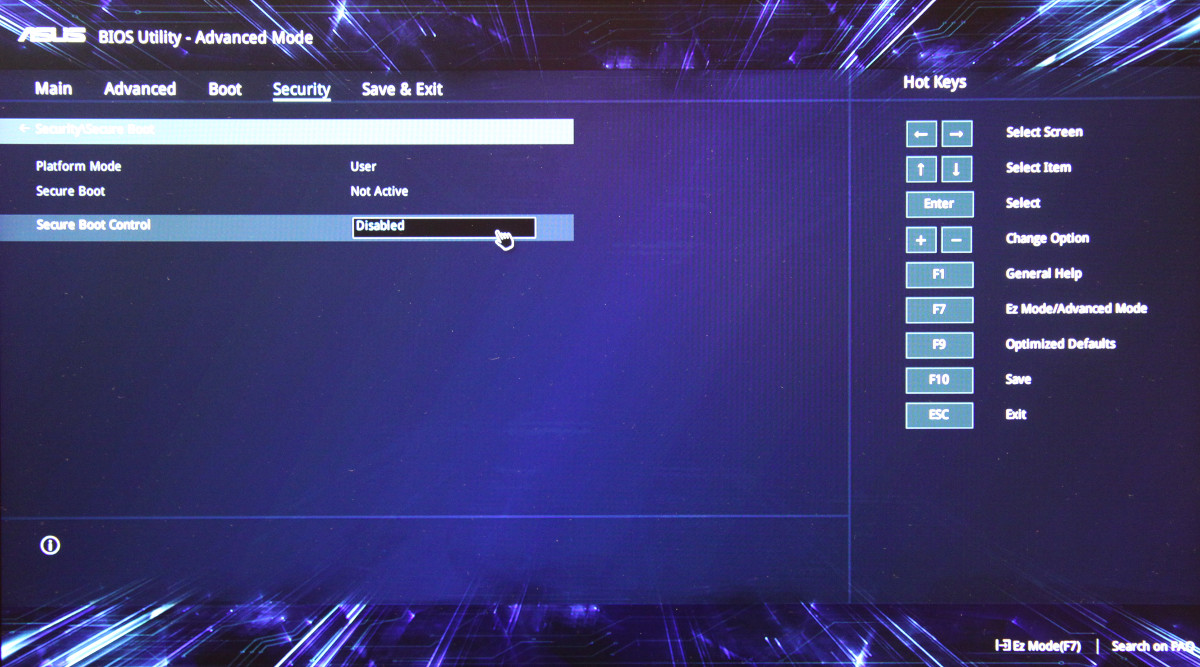 From here, press F7 to enter "Advanced" mode, and use the arrow keys or mouse to tab over to the Security options. Towards the bottom of that tab, there's a sub-menu for Secure Boot. Enter that menu, and disable Secure Boot.