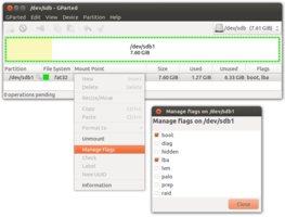 Before getting to boot, it's important that the partition of the USB stick which holds the image is marked as bootable. In GParted, this can be done with the option seen below. Once that is taken care of, transferring the ISO is easily done with UNetbootin.