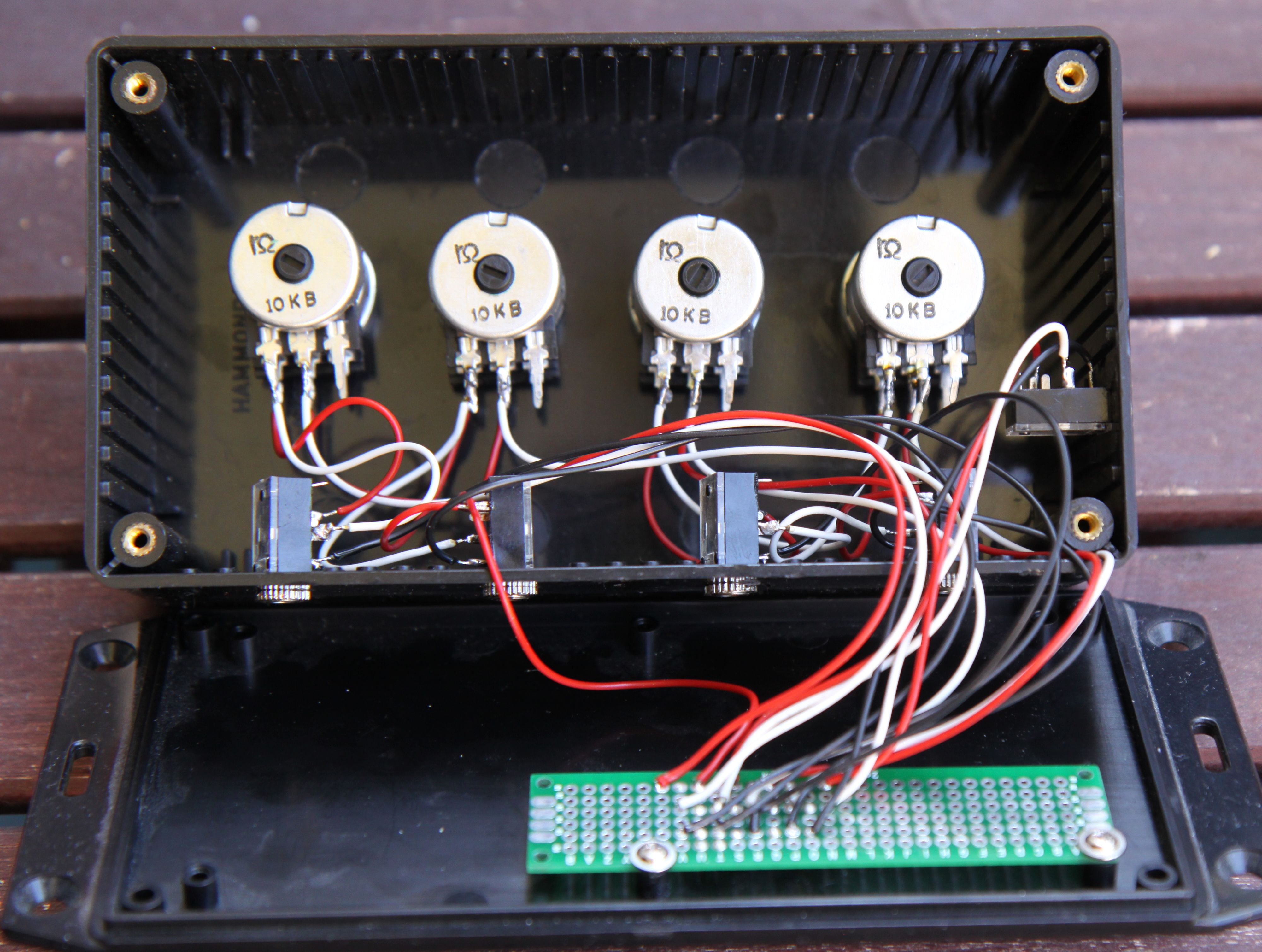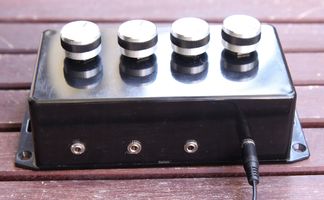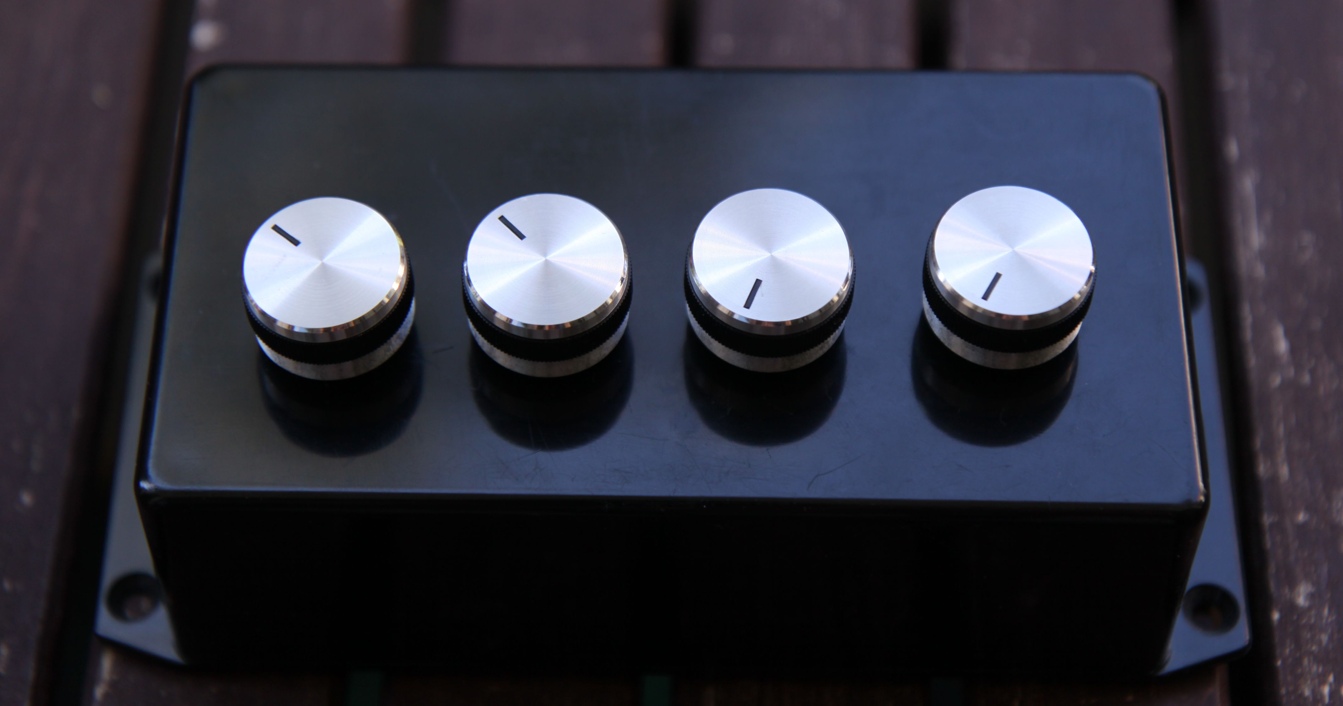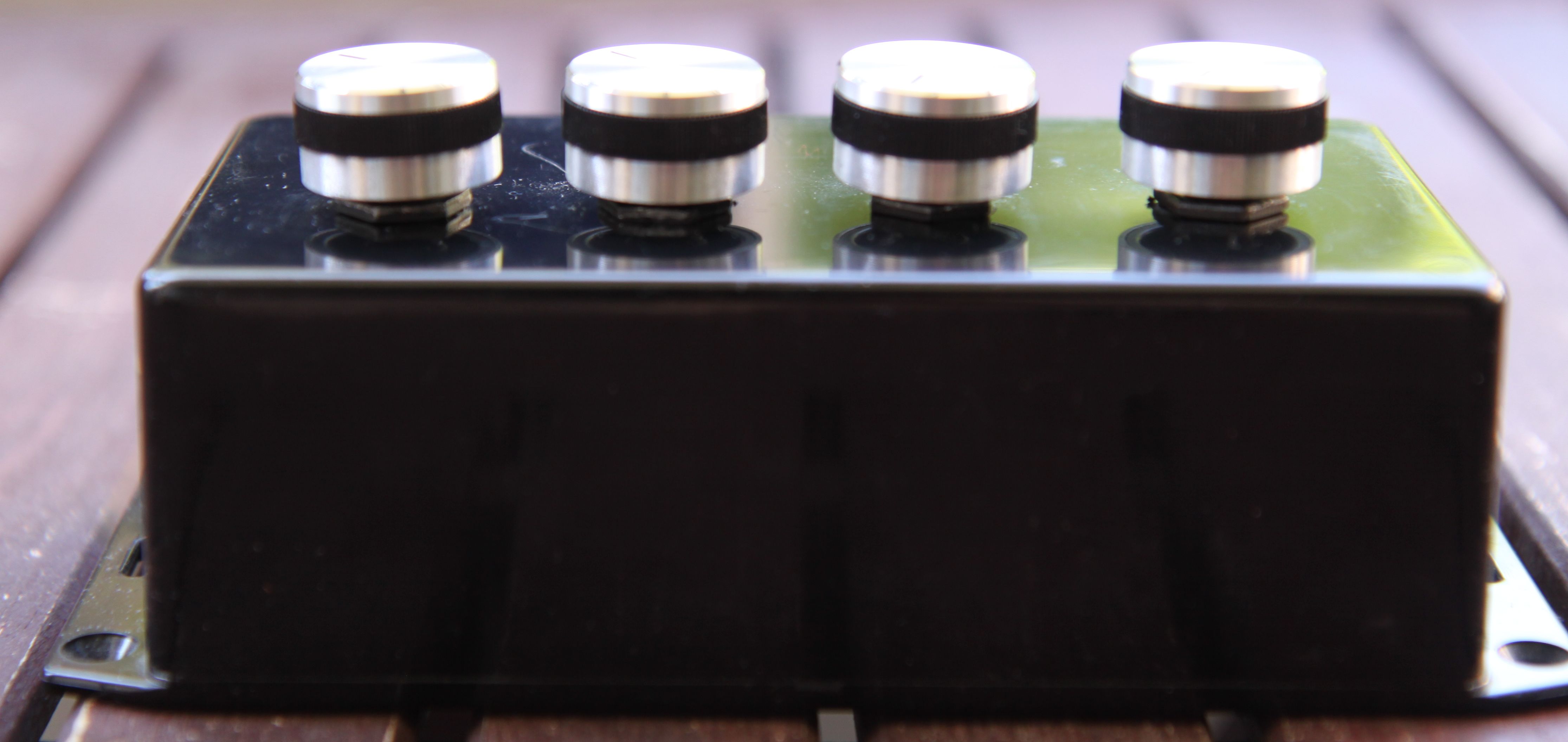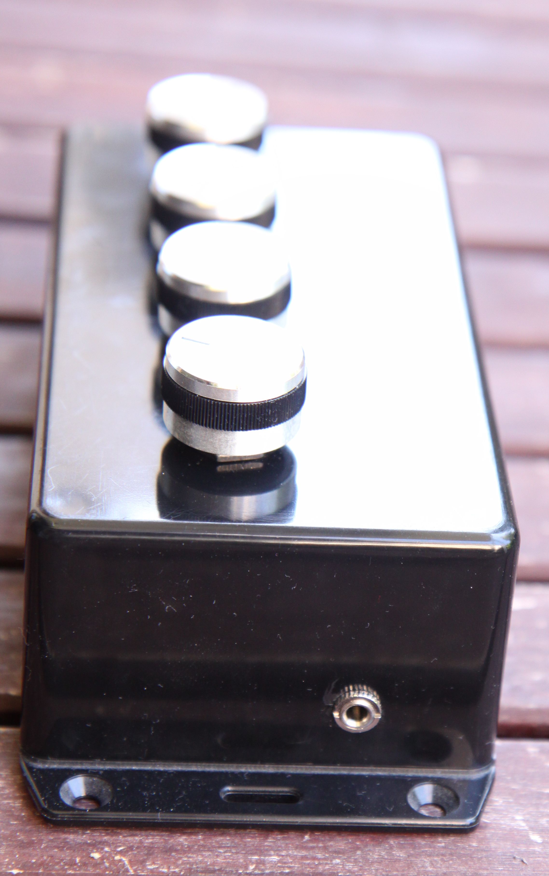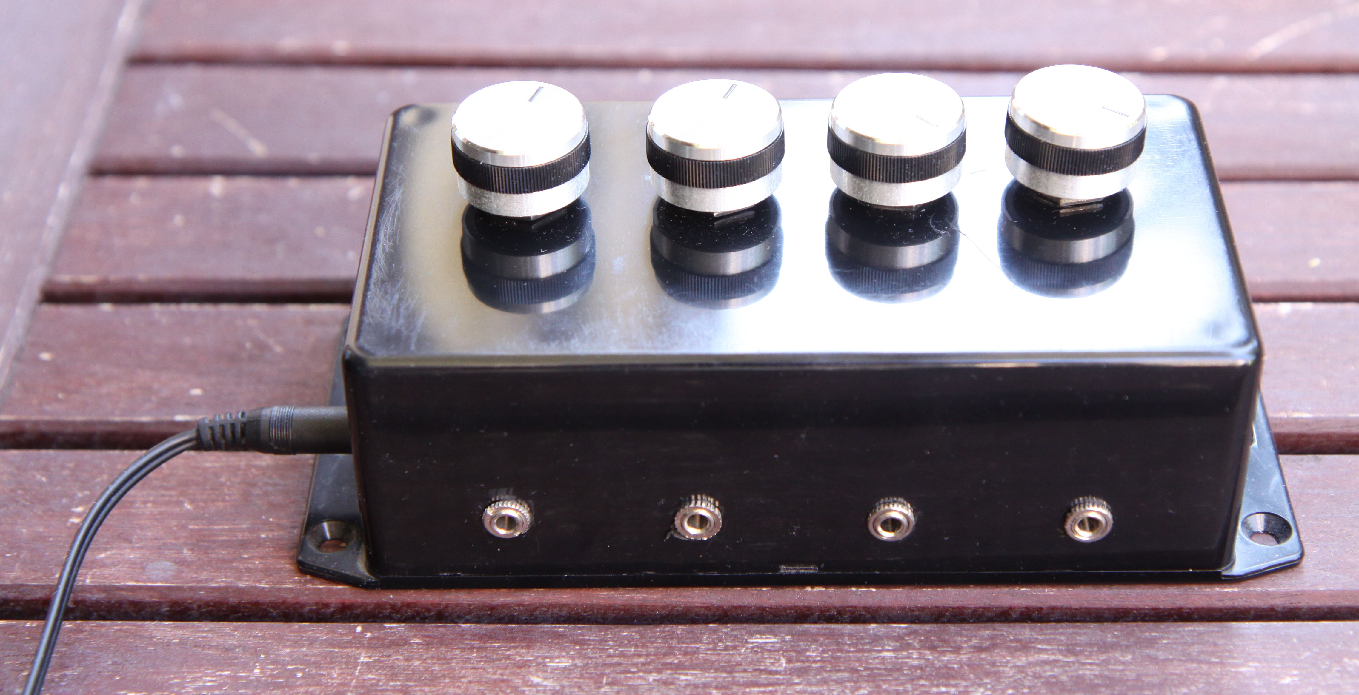 As the pictures show, it's a simple small box, with four inputs, four rotary knobs, and one output. I liked the knobs, however, had wished they could be flush with the surface of the box. They were not made for the potentiometers I got, and it took some Dremel work to make them fit at all. The wiring got a bit messy, and combined dual or even three wire would have made it look better on the inside.