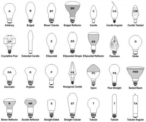 There are lots of different types of bulbs, sizes and shapes. Courtesy of mapawatt, here's an overview of different kinds. The A (normal) and G (globe) annotation you sometimes see used on products. The sizes in America are in 1/8 inches, while millimeters is used in Europe. E.g. an A19 is an A shape bulb which is 2.375 inches in diameter (19/8). The A19 size happens to be the standard light bulb size, for example as seen in the GO/ON and Osram 11 W bulbs below. 2.375 inches is 60 mm, which is the diameter of the those bulbs at its widest point, thus the European marking will be A60. Another common size is the G30, a globe of of 25 / 8 inches or 95 mm, which is the shape of the two large bulbs at the end of this test. Finally, the "oblong pear" is common, as ST64 (mm) or ST20 (1/8 inches).