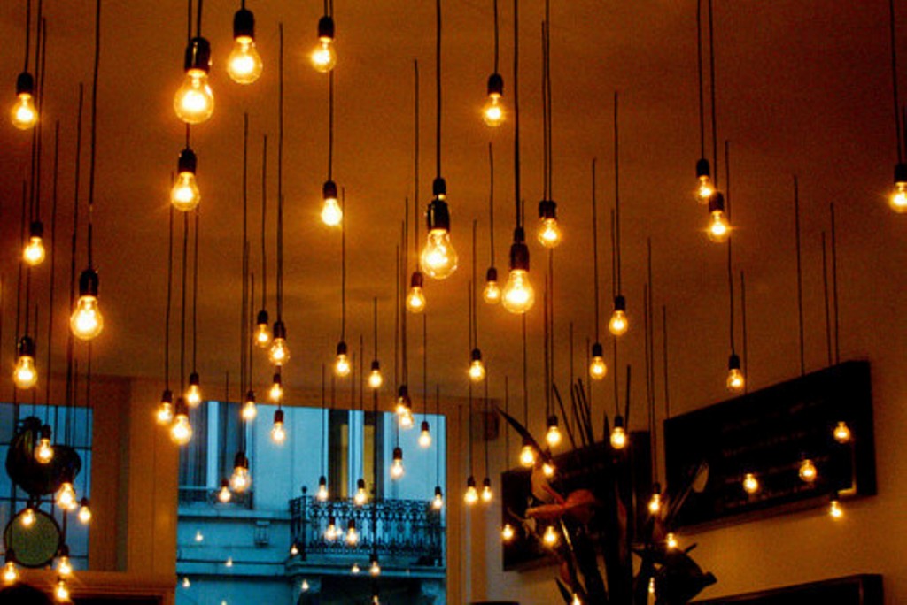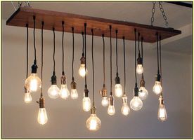 When it comes to the arrangement of such a setup, there are many ways of creating an interesting look. Some go for an orderly symmetric shape, which makes it look like a chandelier, while others are intentionally disorganized and scattered at different heights and positions. In between, there's the "plank" instillation below, which uses a dark wooden board as the mounting-point, but still has many different sizes and heights.