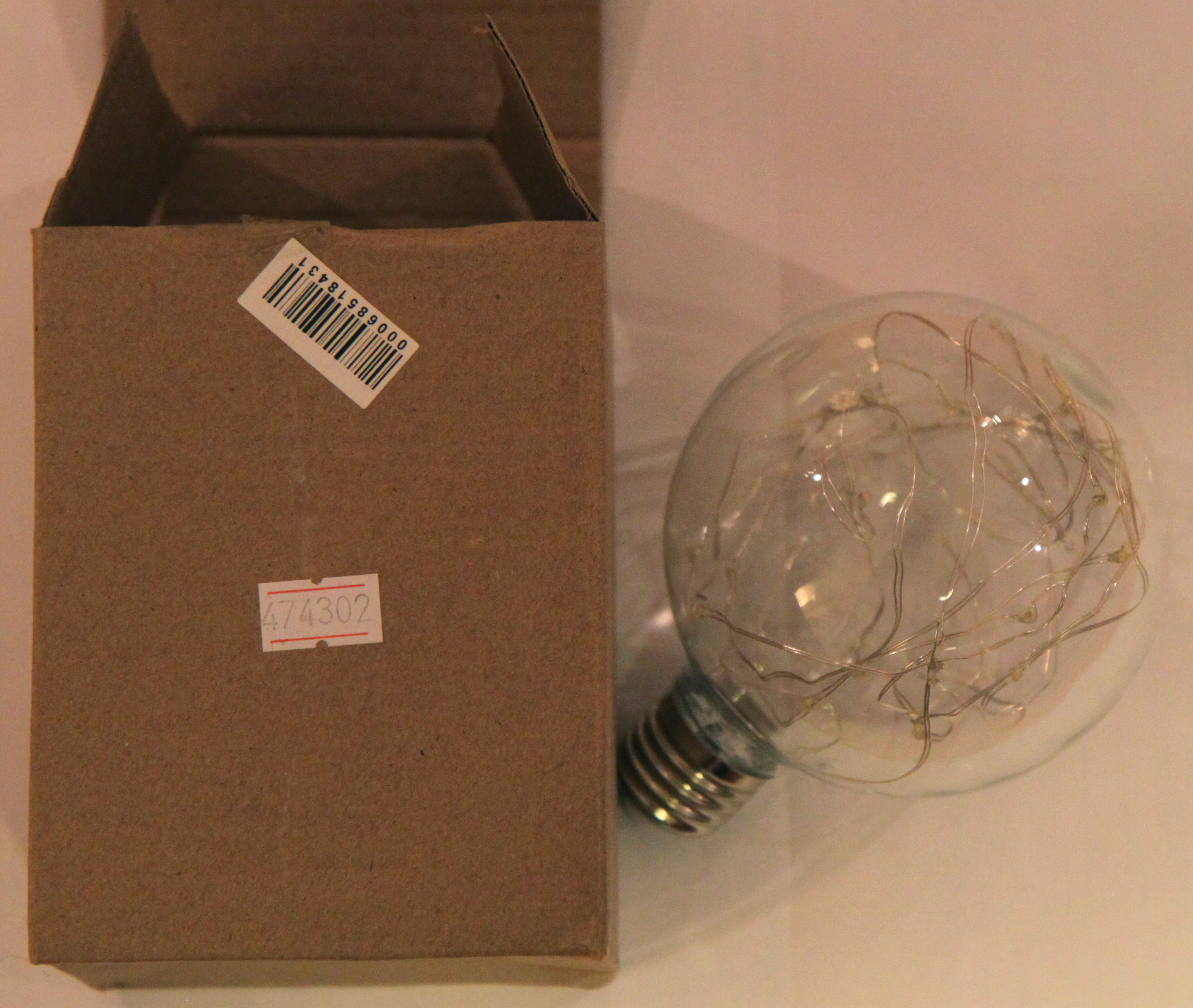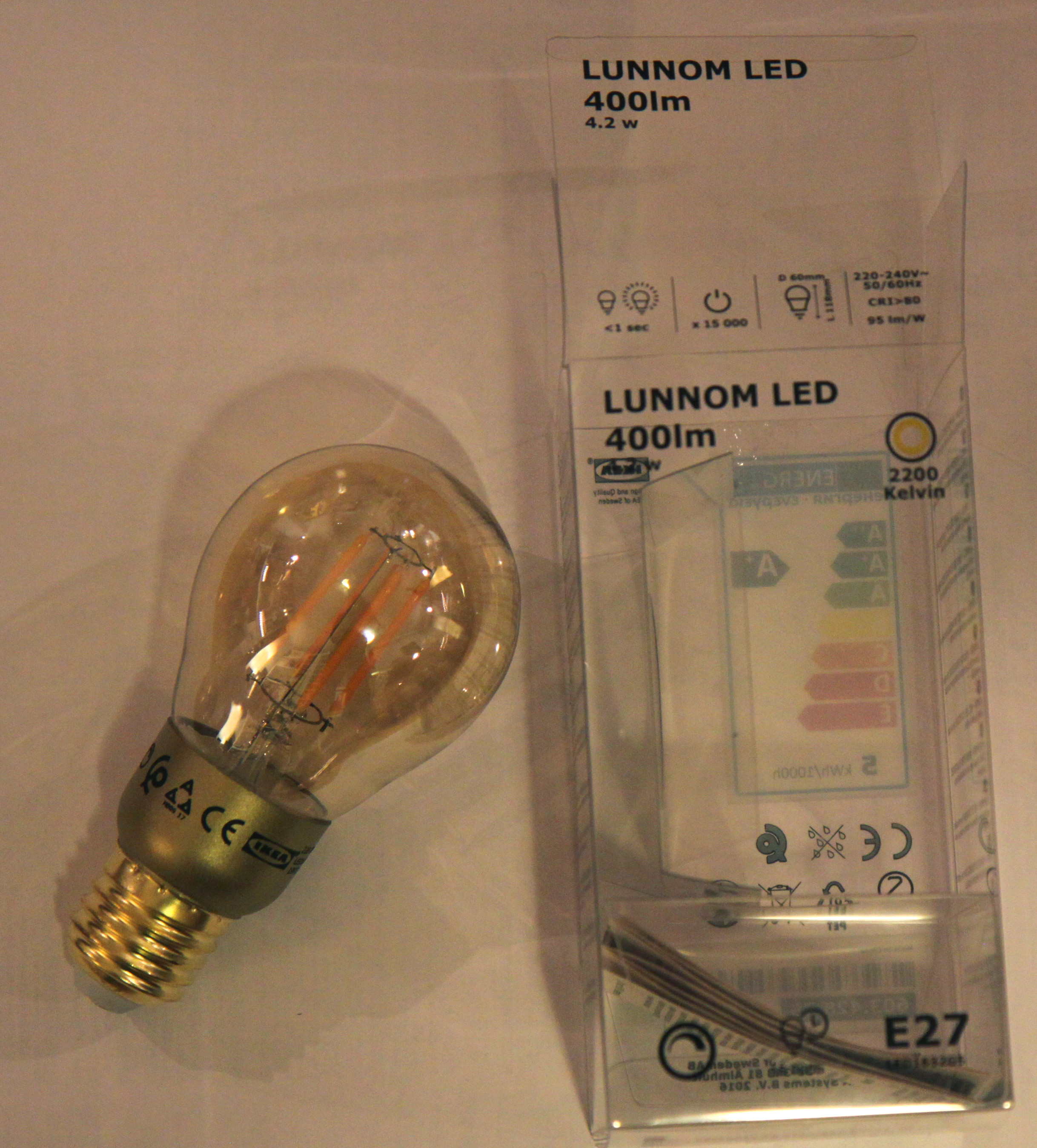 Ikea's standard filament LED bulb an A60, but slightly longer than a normal sized light-bulb, however will still fit in most lamps. It gives good light, but too warm and yellow for reading more than a page. The glass is light yellow-tinted. Still, it is also too bright to look at directly, so as decoration it would have to be high in the ceiling to avoid accidental stares. |