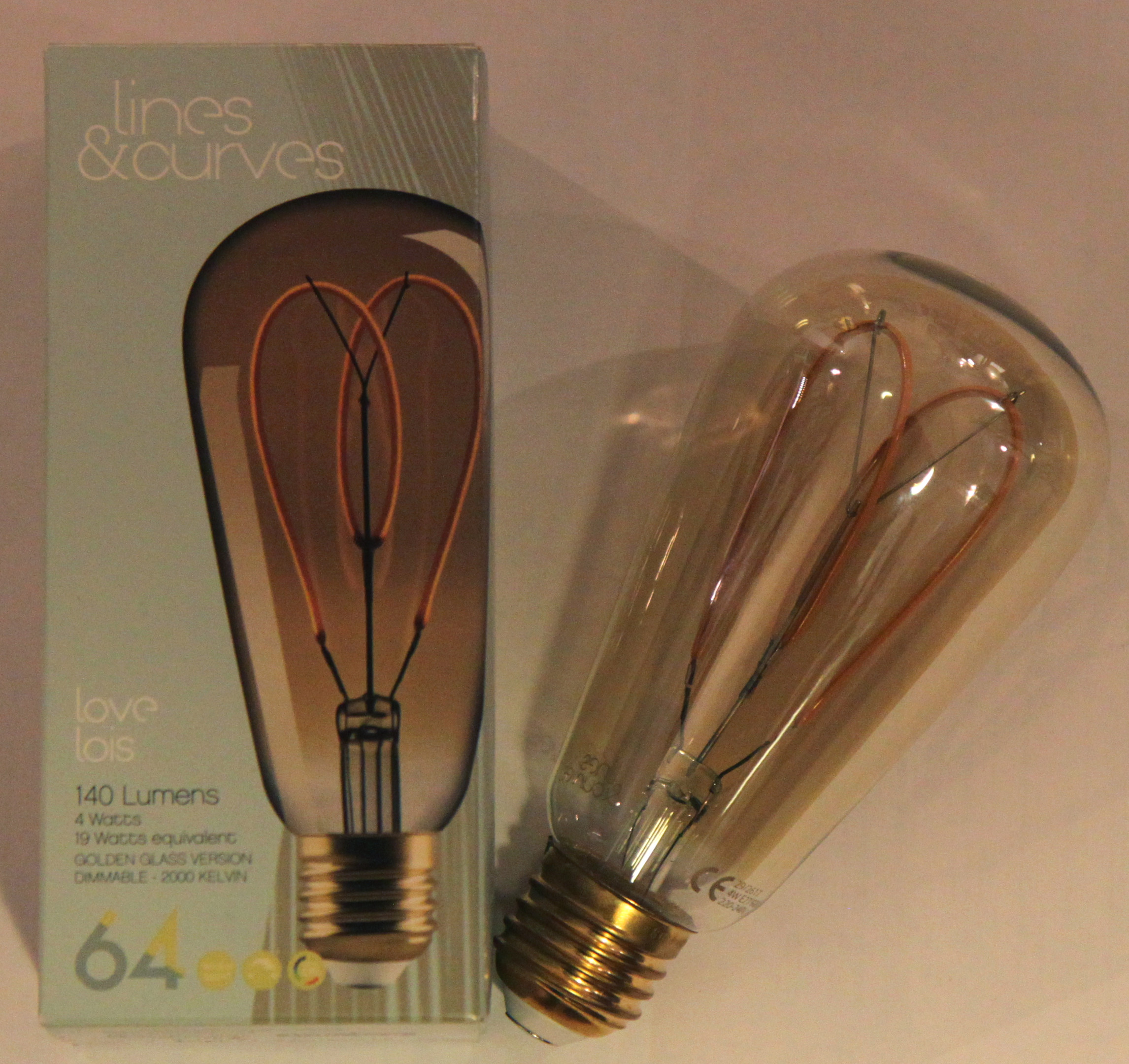 Price: €10 An oblong pear shaped large bulb ST64, so potentially decorative. However, the light is close to standard white, and at 470 lumen, it is bright enough for light reading. However, might also be too bright for decorative use. Maybe it could be nice inside a tinted glass enclosure, like a large bottle or vase. |
