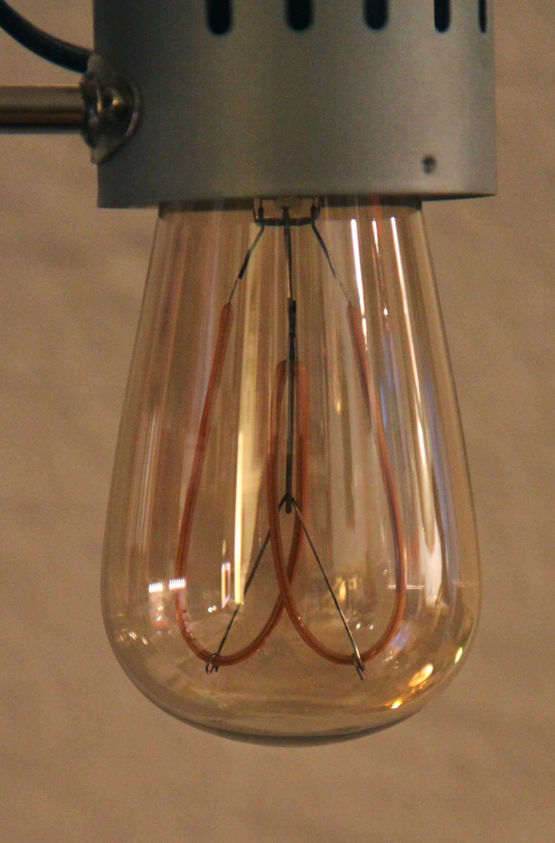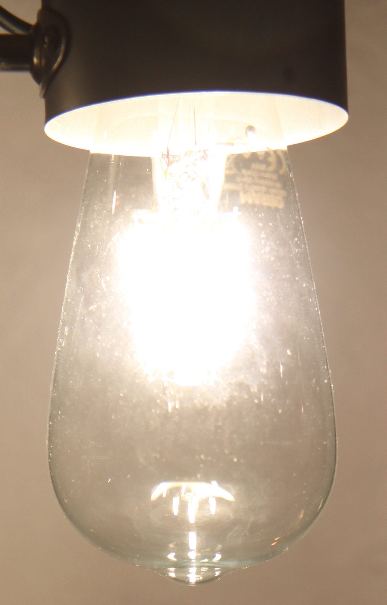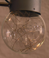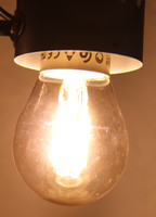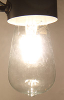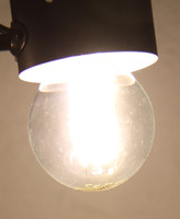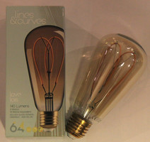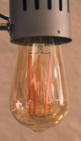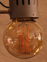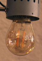 Moving on to the cosy and decorative bulbs, this is an oblong pear shaped large bulb, with a warm dim light. Its two long filaments are shaped in curves, and creates a nice pattern. The smaller "threads" in the center of the bulb in the picture to the right are reflections of the filaments. With its tinted glass, it looks interesting also when turned off. |