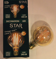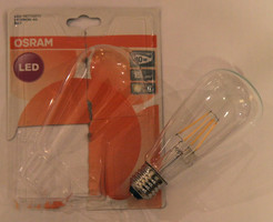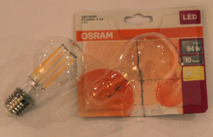 A normal sized light-bulb for drop-in replacement in most lamps. The light is close to standard white, with a hint of yellow. At 470 lumen, it is bright enough for light reading. However, it is also too bright for decorative use, and its two filaments and standard shape is not too inspiring. |