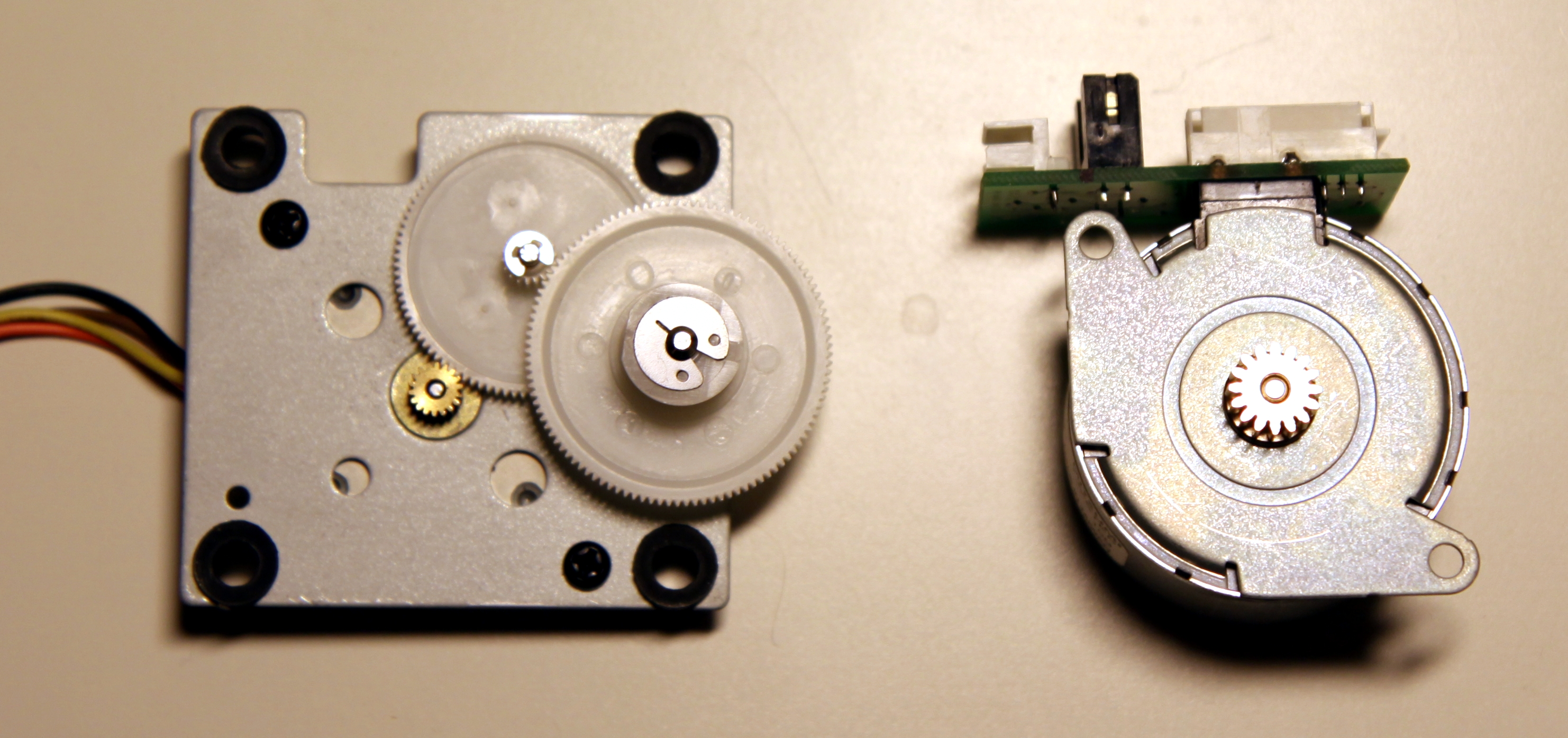 The second motor (to the left in the picture above) was from the scanner, moving the scanning head back and forth. As can be seen from the image above, it already has two gears neatly attached. I haven't counted, however I'm guessing the gear ratio is more than 1:150 to the top gear. It has four wires coming out, and has the following on the sticker: