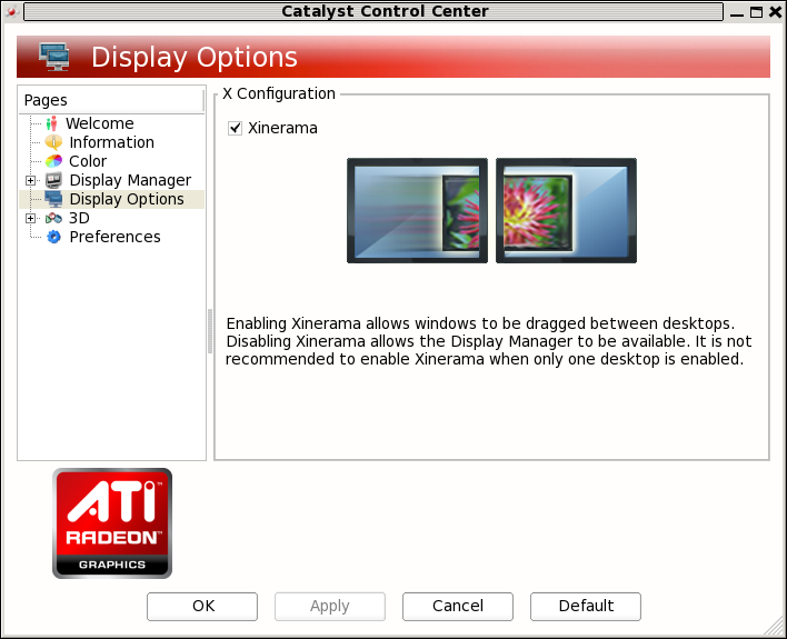 Note that for a single desktop over dual displays, you'll have to enable Xinerama under Display Options. Before you do that, confirm that the driver and card works with dual display over multi-desktop.