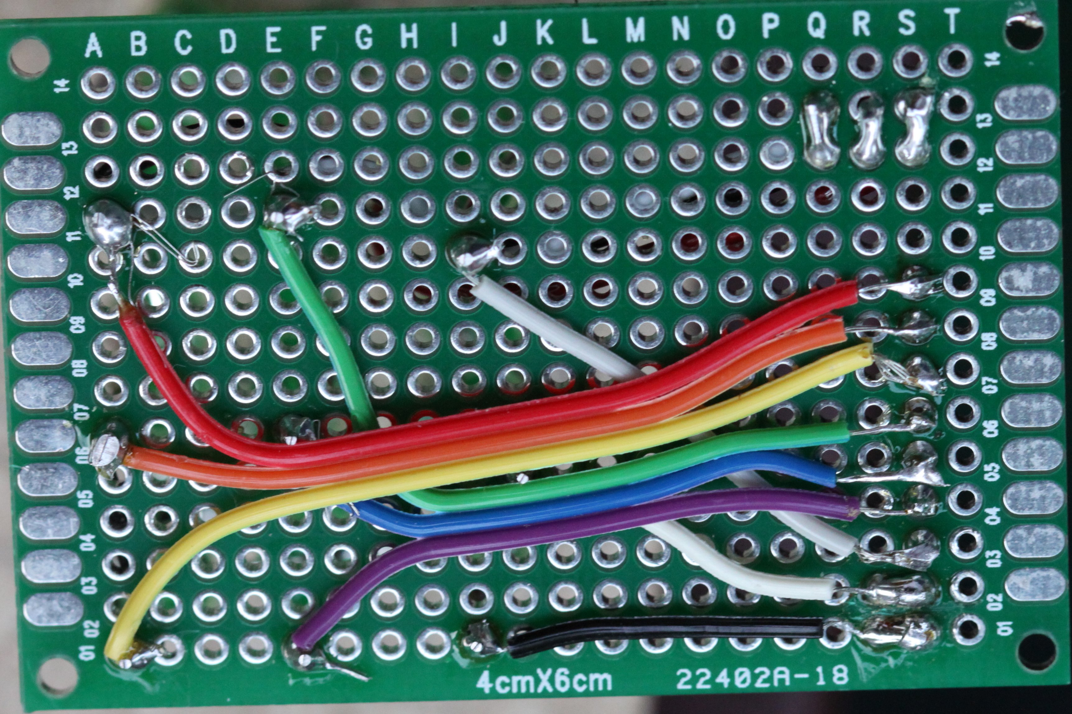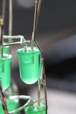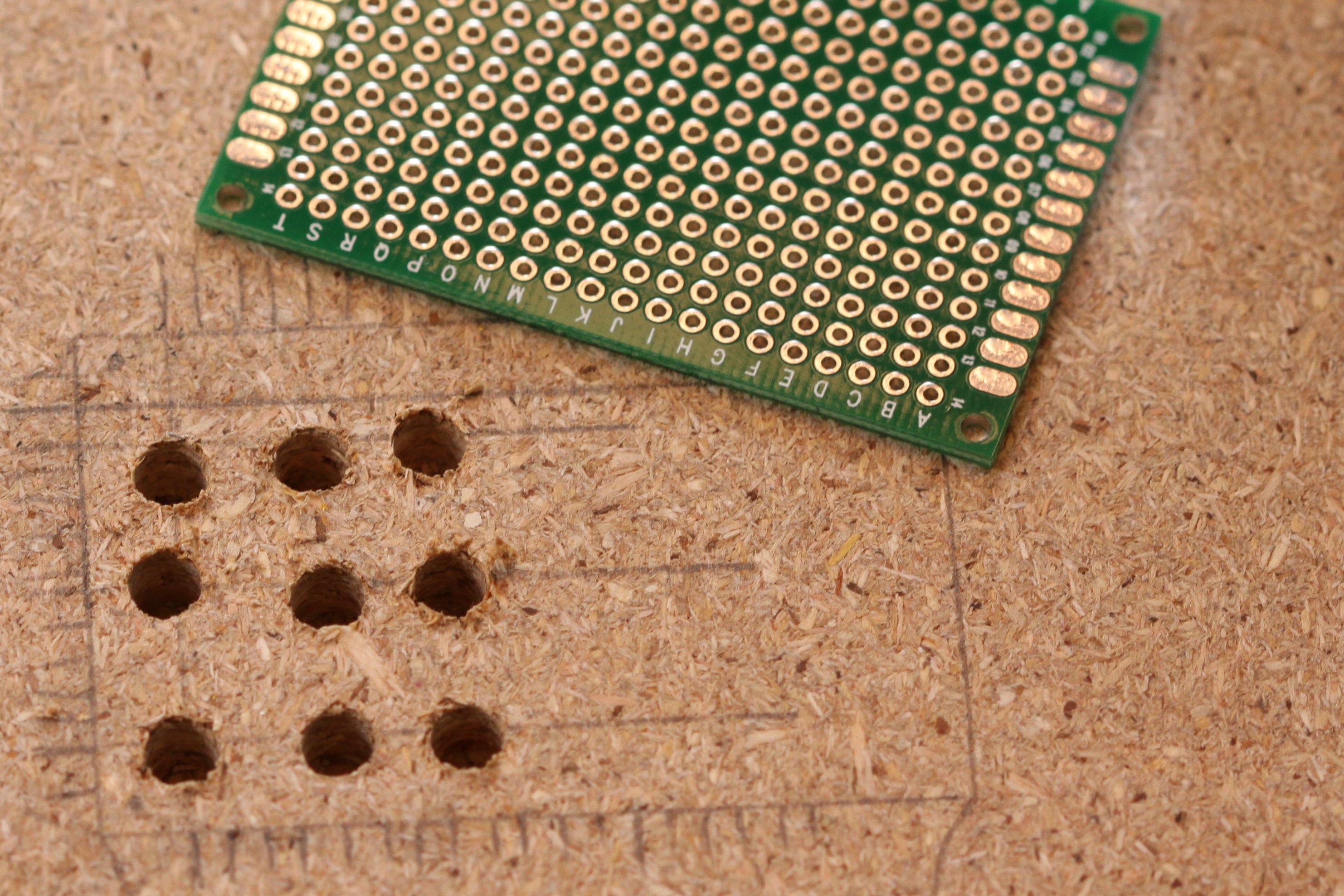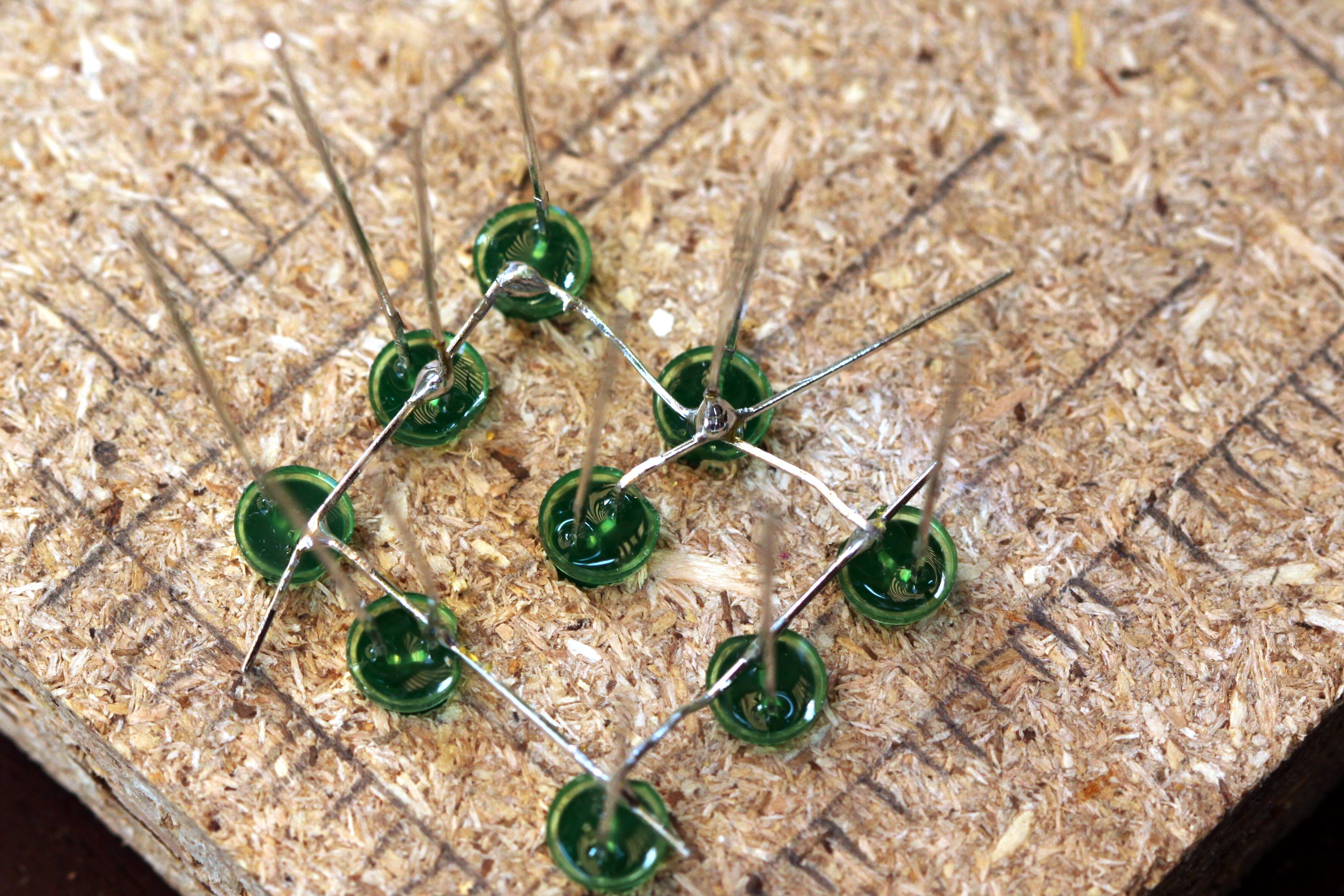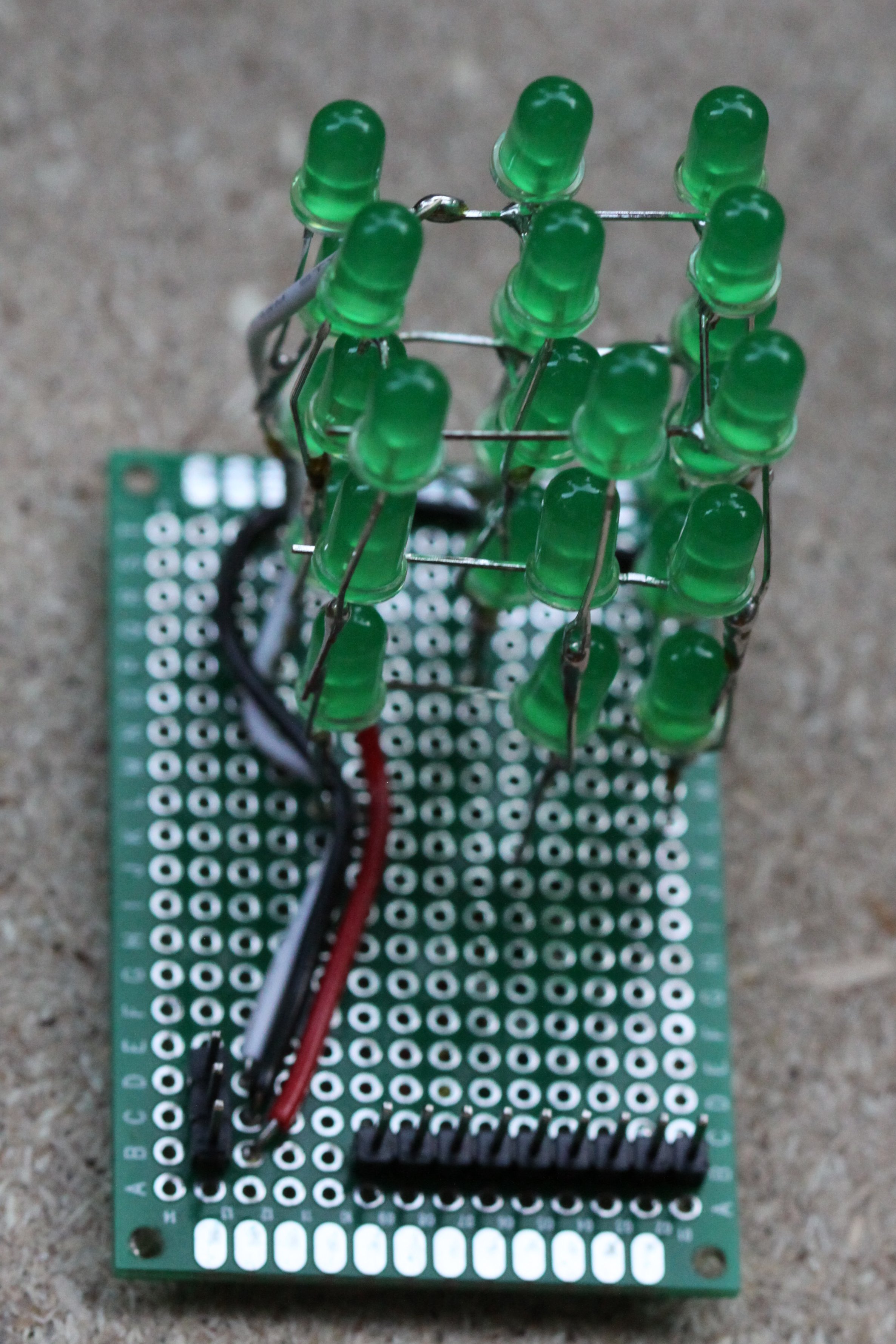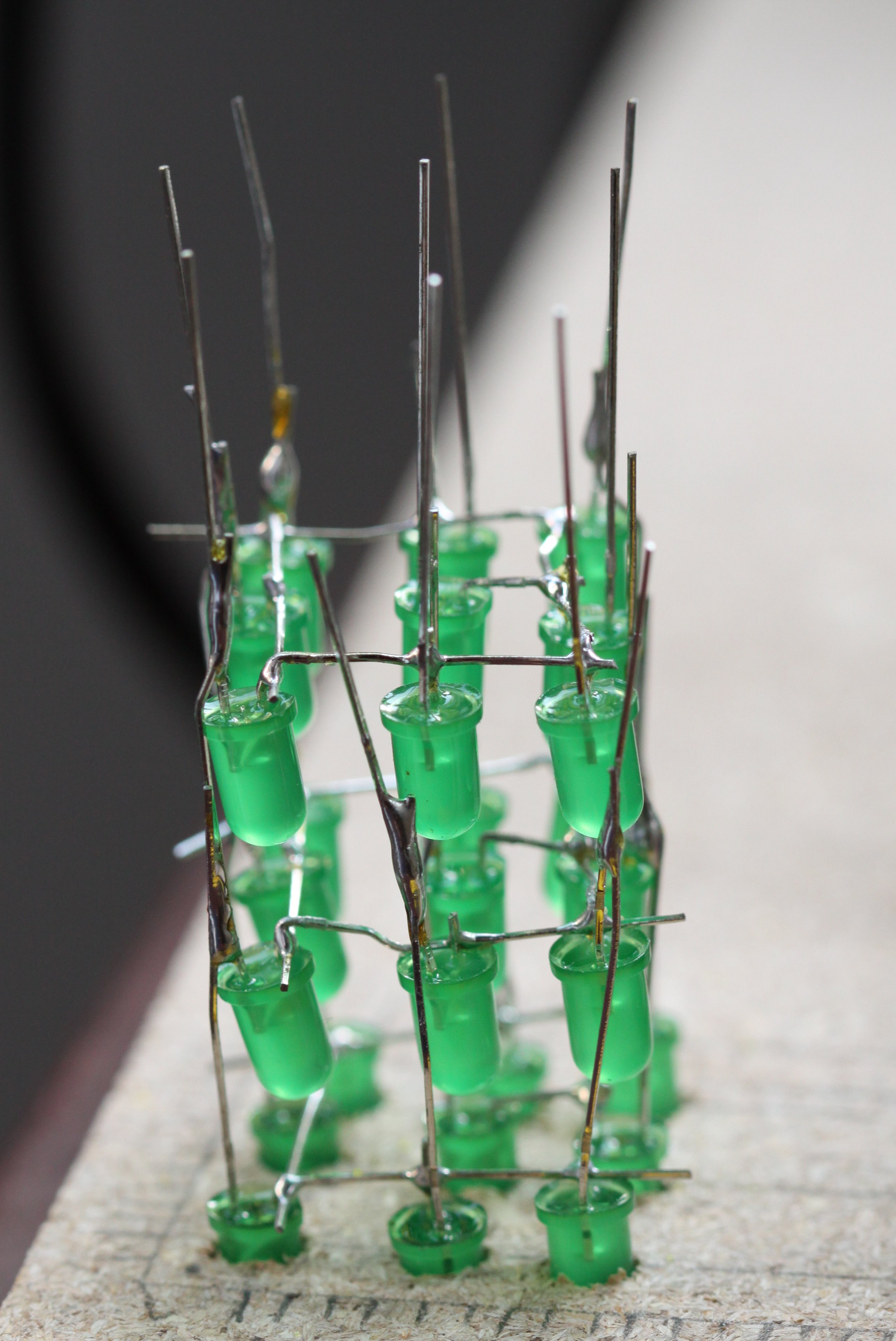 For the construction of the cube, I used LEDs from a 100-pack for $4.30 from DealExtreme, soldered onto a small 4x6cm (14x20 points) PCB. Following “fruitkid101″ video instructions, I drilled holes for a template in a piece of wood. As it was all by hand, it turned out a bit skewed, but for this small project I found it didn't matter so much. Next time I'll be a bit more precise. Soldering the legs together turned out be easy. I made the spacing between the LEDs small enough for one cathode leg to reach across its two neighbours, which meant that I only had to bend the ones in the corner. I soldered the corners first, and then the ones in between, finishing off with the centre LED. Positioning the anode legs between the layers was a bit more tricky, but with a double bend, as seen in the picture below, it was easy to make the leg from the layer beneath stay close enough to solder to its upstairs neighbour. Since the joints were for both the electrical contact, as well as the structural, I applied quite a bit of solder.