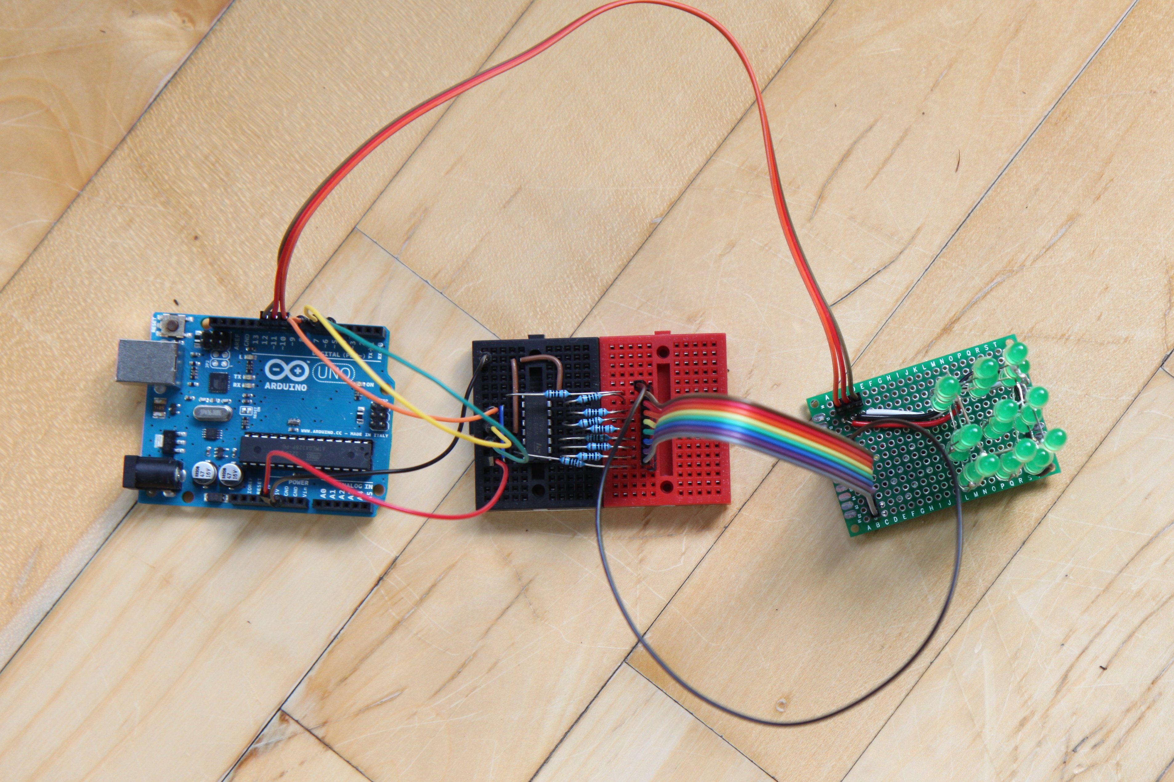 Future work will include utilizing the Arduino timer library for controlling the display buffer. Currently, that bit of the code is rather clunky. I would also like to experiment with fading and controlled blinking. Again, the timer library will be useful, but I'd probably also use the buffer to hold an intensity value, rather than just on/off. Also, I would like to measure the brightness with the different delays discussed above. One way would be using an LDR (light dependent resistor), but I might also look at the cheap $30 lux meters from DealExtreme. Finally, I'll of course have to make some interesting patterns and animations, which should lead to an API for some level of abstraction. There's lots to do!