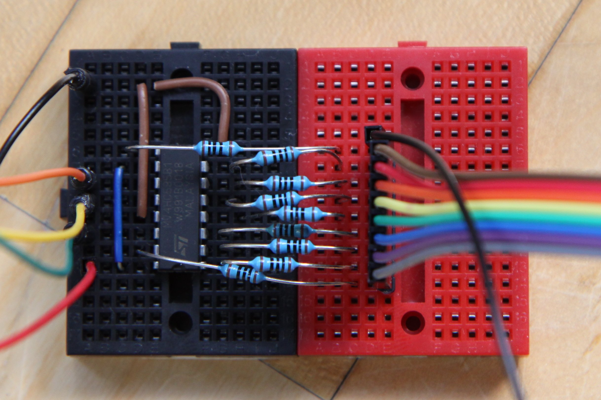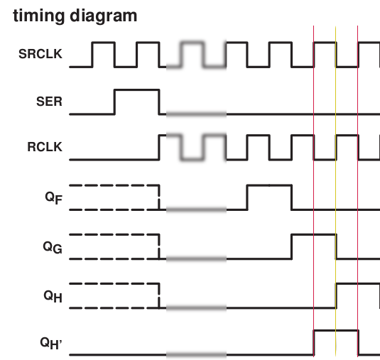The diagram above is truncated both in the horizontal and vertical axis, to highlight the last cycles, when the output pin, denoted QH' in the digram, gets its value. As can be seen, when the 7th pin, or QG, is shifted up one (the first red line, when RCLK goes from high to low), QH' gets that bit set as well. Note that the internal states of the shift register is not shown here. In the next cycle, SRCLK is latched, and the internal value of the 8th pin is made visible on QH, on the yellow line. The result is, that either QG + QH' are on at the same time, or QH + QH'. This was frustratingly easy to reproduce in code, but not what I wanted.