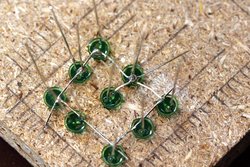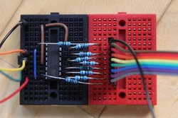 A few weeks ago, I mentioned that it would be possible to optimize the number of wires and components needed for a 3x3x3 single colour LED cube by using "the 9th bit" (the output pin, intended for daisy chaining) on a 8 bit serial in / parallel out shift register. Other examples of the 33 cube I've seen are simply pulling 12 wires (9 LEDs on each layer, and 3 layers) back to the Arudino. At that scale, it is of course feasible, but still, when it's possible to get by with half, why not? So I put together a small 33 cube doing just that.