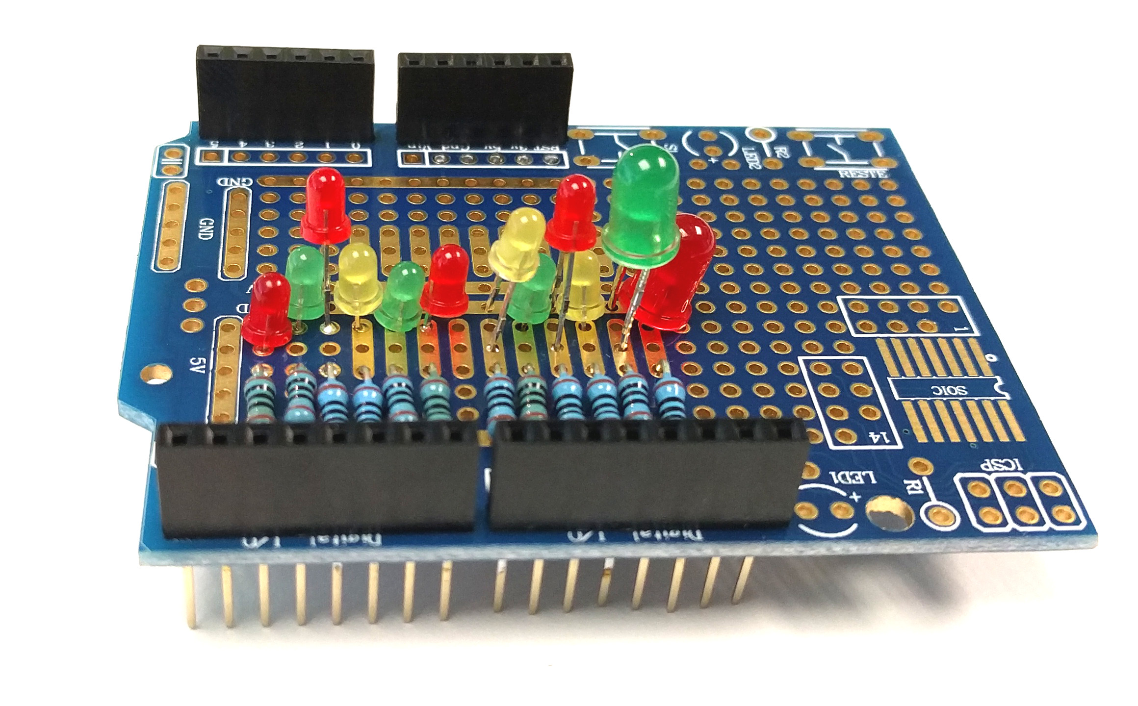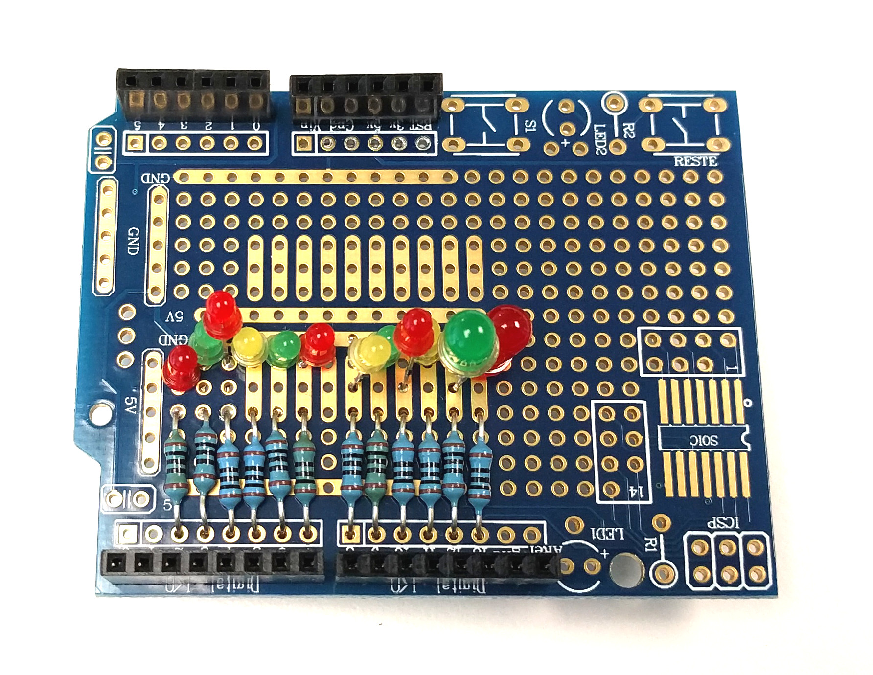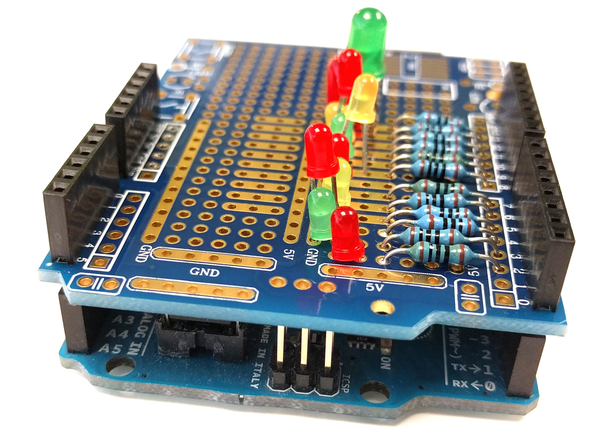 DealExtreme supplies all the parts needed: A versatile prototyping shield board with holes and wires in sensible locations; a bag of assorted LEDs; resistors; and header pins. (The board and headers in this project used 6x and 8x header pins, to fit with the older Duemilanove. The Uno another other boards have slightly different pin layouts, so plan ahead).